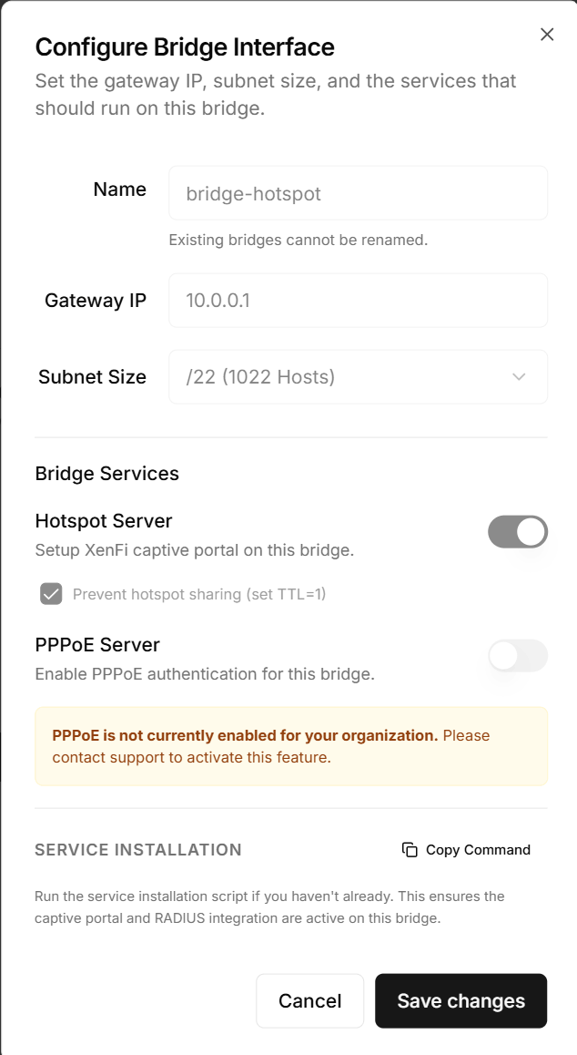 Setup Hotspot Server: Under IP > Hotspot, run the generic Setup wizard on your bridge, or manually attach a Hotspot Server utilizing the DHCP Pool you created. Use the XenFi profile if it was created, or configure it to point to the XenFi RADIUS address.