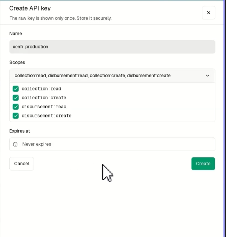 This section allows you to generate keys that enable communication between XenFi and the Snippe payment system.