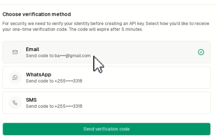 Choose a verification method (Email, WhatsApp, or SMS)